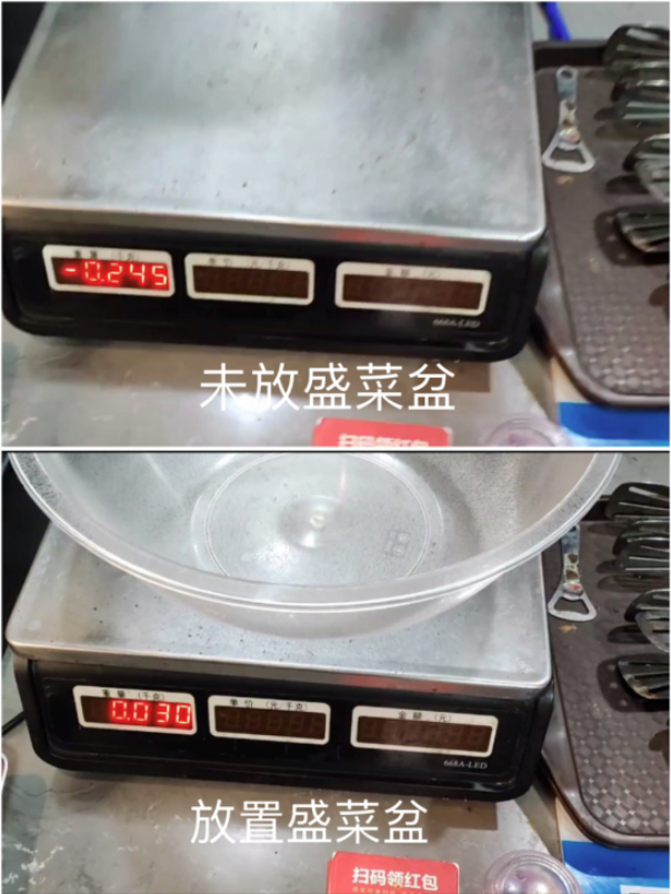 但在检查过程中,执法人员发现其中一家麻辣烫经营户销售食材时去皮未彻底,未放盛菜盆时电子秤的重量显示为-0.245kg,而放置盛菜盆后重量显示为0.030kg,即该经营户每销售一份麻辣烫就会多收取消费者30g食材的费用。该行为涉嫌欺诈消费者,损害消费者权益,执法人员予以立案调查。