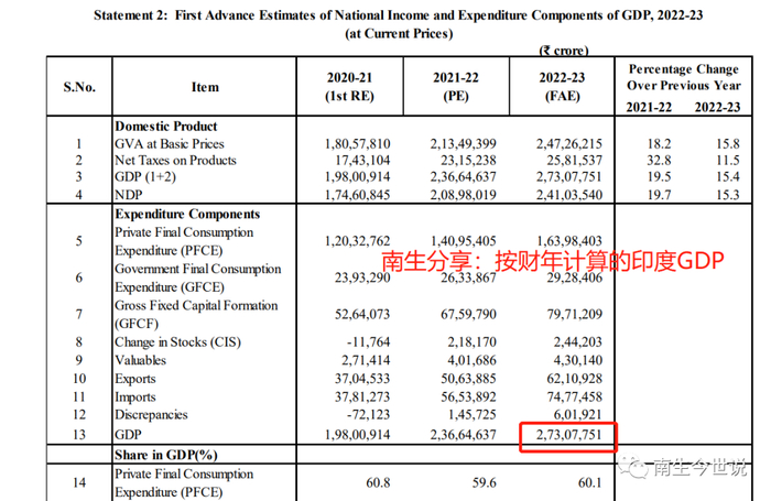 2023财年就是从2022年4月份开始,到2023年3月份结束。再加上2022这个自然年份的数值,我们就得到了“两种不同年份的印度GDP”,分别是3.38万亿美元和3.47万亿美元。