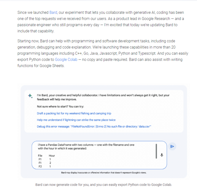 谷歌研究(Google Research)的产品负责人介绍称,自从3月向公众开放Bard以来,“协助编程”一直是用户最热门的要求之一。编程新功能可用于20多种编程语言,包括 C++、Go、Java、Javascript、Python 和 Typescript。还可以将Python代码直接导出到Google Colab云端工作平台。