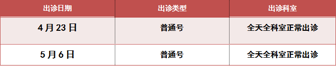 4月23日(周日)、5月6日(周六),正常上班。分别按照周二、周三门诊安排出诊。