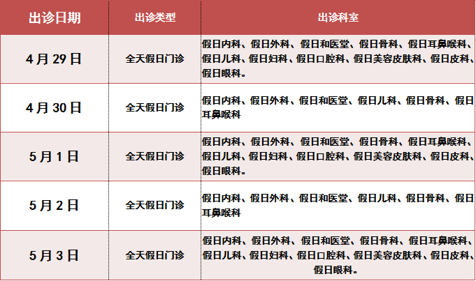 4月29日至5月3日全日普通门诊,出节假日专家门诊。