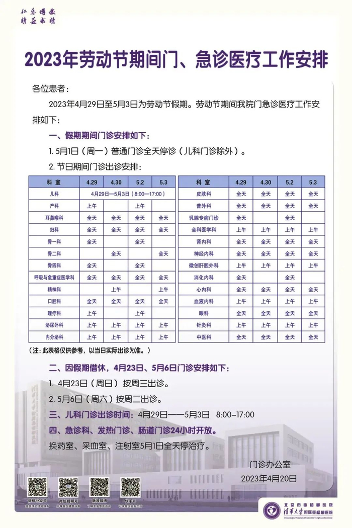 3、针灸科(东区)4月30日全天开诊;4月29日、5月1日至3日仅上午半天开诊。