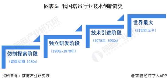 自建国初期至今,我国塔吊技术创新经历了“仿制探索—独立研发—技术引进—中国成为世界最大产销国”四个阶段。