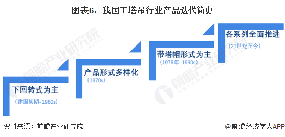 自建国初期至今,我国塔吊产品发展经历了“下回转式为主—产品形式多样化—带塔帽形式为主—各系列全面推进”四个阶段。