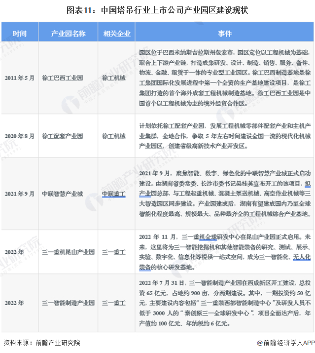 目前我国塔吊产业园区的建设主要主要围绕龙头企业和第二梯队上市企业建设。其中,2011年5月,为加快走出去和国际化的步伐,徐工投资2亿美元在巴西建80万平方米的徐工巴西工业园;随后,徐工配套产业园、中联智慧产业城、三一重机昆山产业园、三一智能制造产业园陆续开建。