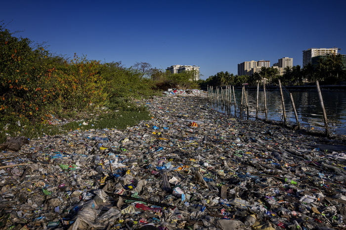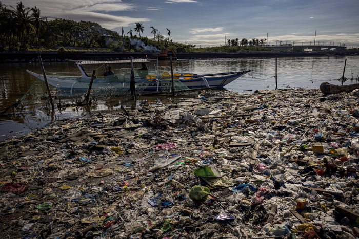 当地时间2023年4月19日,菲律宾马尼拉,帕拉纳克,一艘船停靠在自由岛的一个充满塑料垃圾的海滩上。牛津大学“用数据看世界”2021年的一份报告显示,菲律宾是世界上最大的海洋污染者,在全球80%来自亚洲河流的海洋塑料中,菲律宾贡献了三分之一。贫困导致菲律宾成为“小袋经济”,每天消耗1.63亿个小袋子,加剧了该地区的海洋塑料污染。垃圾堆积在陆地上,堵塞海岸线,流入海洋,并流向全球偏远的地区,因为该国未能实现20多年前签署的改善垃圾管理的目标。
