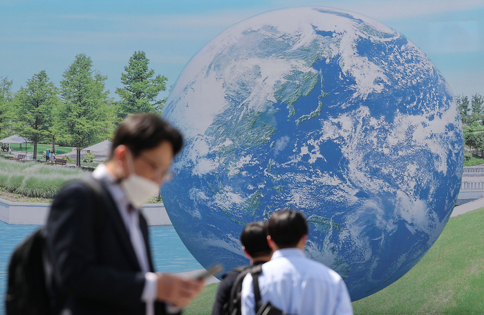 当地时间2023年4月21日,韩国首尔,在距离世界地球日还有一天的时候,市民正走过首尔一栋建筑物外墙上悬挂的地球画。
