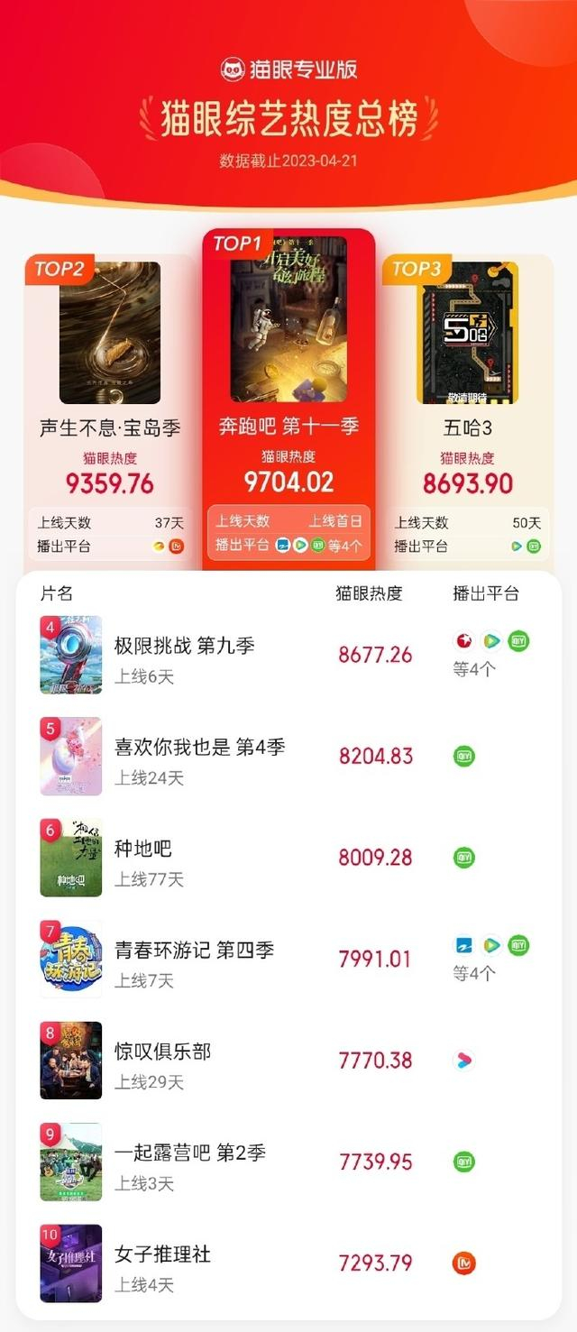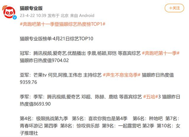4月22日,据猫眼专业版微博:猫眼专业版榜单·4月21日综艺TOP10
