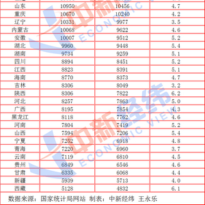 从增长速度看,陕西、西藏、湖北、山西、四川、安徽、河南7省份人均可支配收入增速跑赢全国。其中,陕西、西藏增速均超6%。