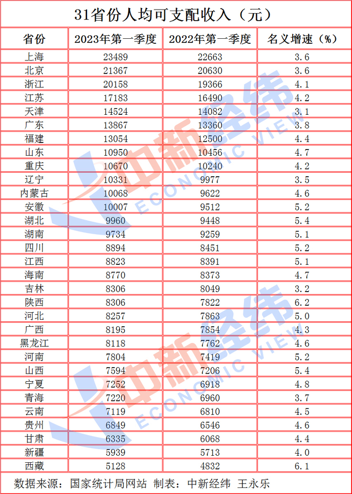 国家统计局日前公布31省份2023年一季度人均可支配收入数据,上海以23489元稳居第一,北京以21367元紧随其后,浙江首次突破2万元关口为20158元。