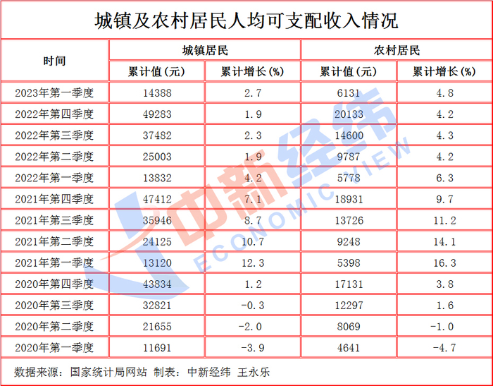 分城乡看,一季度城镇居民人均可支配收入14388元,同比名义增长4.0%,扣除价格因素,实际增长2.7%;农村居民人均可支配收入6131元,同比名义增长6.1%,扣除价格因素,实际增长4.8%。