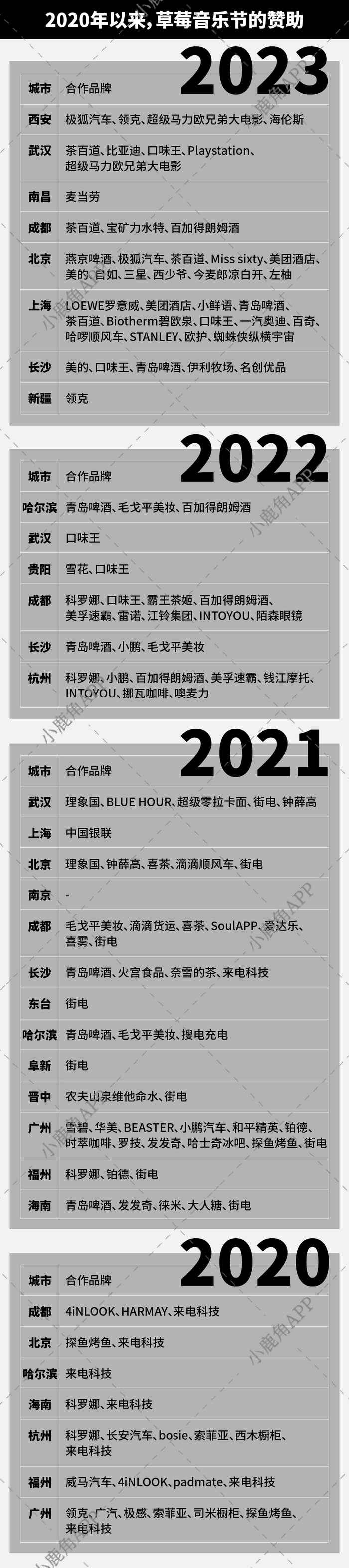 从赞助情况来看,大致有三类品牌与草莓的合作非常频繁,包括汽车、食品、美妆和饮料品牌。其中科罗娜霸占着草莓音乐节冠名的头部地位,疫情三年来共赞助冠名了5场草莓。喜茶、青岛啤酒等品牌更是草莓的老朋友了,早在2010年代便与草莓音乐节合作。值得注意的是,在音乐节热门城市,如北京、上海、广州、成都、杭州等,赞助品牌都会更丰富、更在地化和个性化。