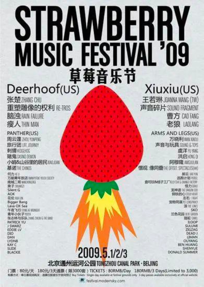 这是2009年草莓音乐节的海报,对于当时国内的大众群体来说,一眼扫下来可能只认识两个人,那就是魔岩三杰之一的张楚和校园民谣代表人物老狼。