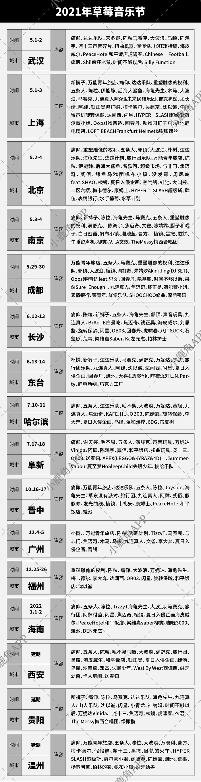 从举办的城市来看,除了北京、上海和广州,草莓是成都、长沙、西安、武汉的常客,今年草莓首次落地佛山取得巨大的成功,南昌、阜宁也成功举办,之后草莓还将首次开进新疆乌鲁木齐,继续落地生根发芽。