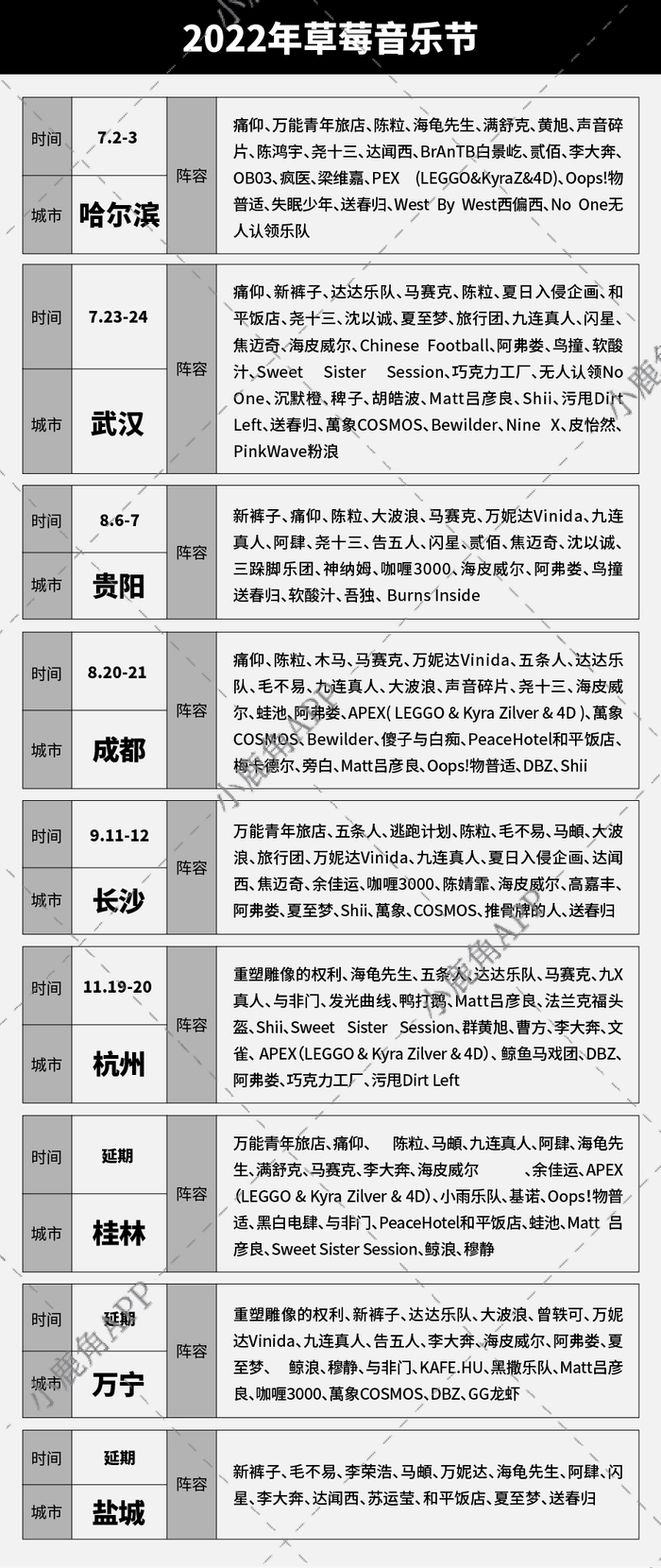 而突如其来的疫情,给演出市场来了一记猛烈的冲击,随之而来的是不断延期和取消的消息,行业遭遇重创。2020-2022三年时间,据不完全统计延期的草莓音乐节共8场,其中去年更是“低谷中的低谷”,仅成功演出6场,延期了3场。