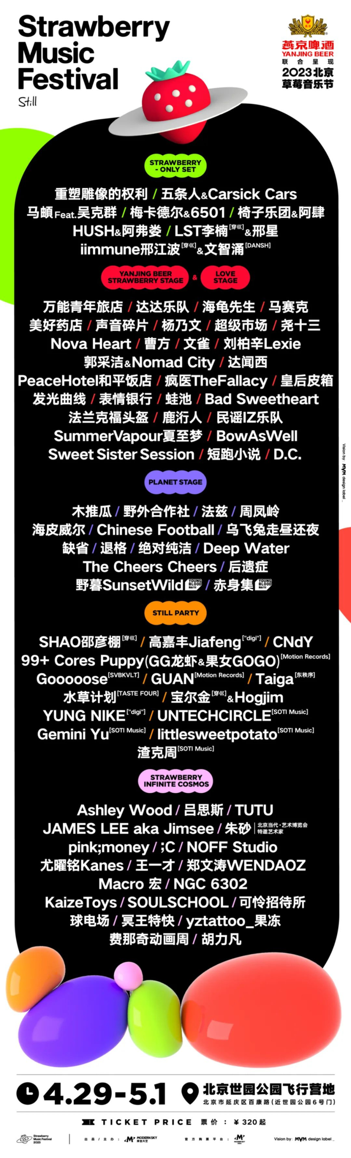 2023年4月13日,北京草莓音乐节全阵容发布,66组音乐人参演,神秘嘉宾吴克群、HUSH、杨乃文、郭采洁已确认参演。