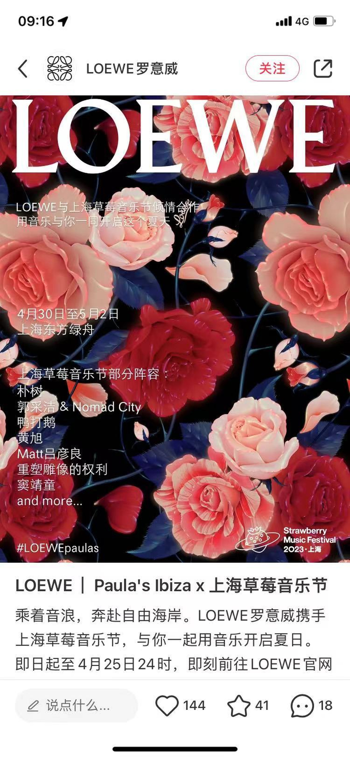 值得注意的是,今年西班牙百年皮具奢华品牌LOEWE罗意威首次选择与上海草莓合作,用音乐开启夏日营销。在早期阶段,摩登天空音乐节和爱马仕曾经合作过一次,当时爱马仕的巨型舞台吸引了许多潮流女孩们打卡留念。