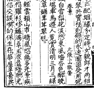 衮香绵柳絮轻,飘白悉尼花淡;怨东风墙杏色,醉晓日海棠酣。景物偏堪,车马游人览,赏清明三月三。绿苔撒点点青钱,碧草铺茸茸翠毯。(明张禄选辑《词林摘艳》卷八)