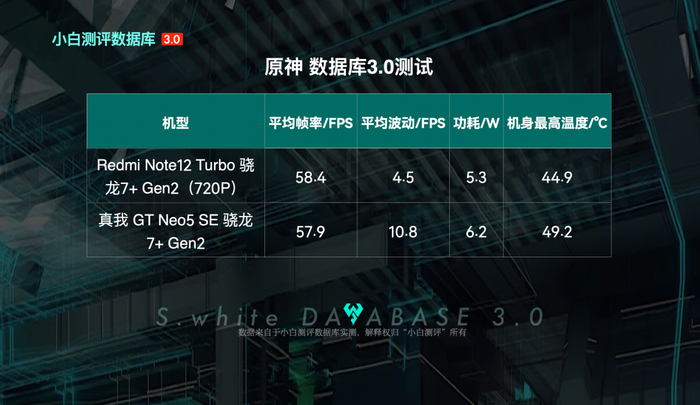 《原神》数据库3.0模型测试,RedmiNote12Turbo平均帧率58.4FPS,功耗5.3W,机身最高温度44.9℃,表现非常不错。