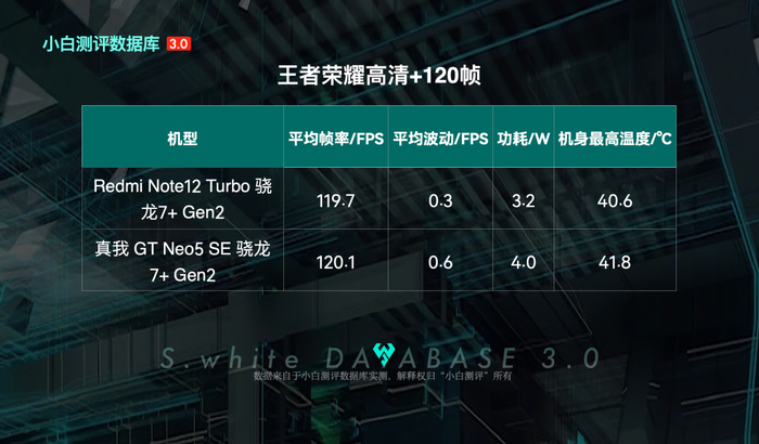 这次骁龙7+ Gen2表现确实非常给力,已发布的两台机型 Redmi Note12 Turbo和真我 GT Neo5 SE,实测王者荣耀高清120都能跑满,红米功耗3.2W,比真我低了0.8W;