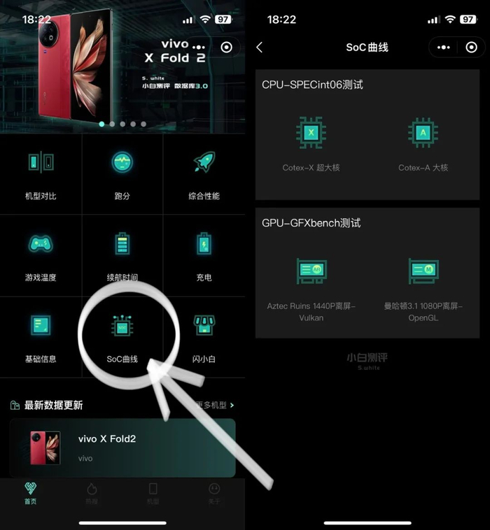 小白测评数据库3.0版在2022年11月5日正式上线,具体数据库3.0解析可戳蓝字回顾。各大新机实测数据小程序均会首发更新,大家可进入小白测评数据库 收藏并免费查看。新增的骁龙7+ Gen2 SoC曲线在小程序首页-SoC曲线,进入各模块即可查看详细曲线变化、大家也可自行进行不同SoC之间的对比。