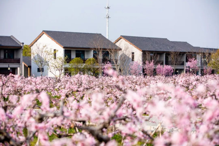 嫣红的桃花亦粉染枝头,与一旁金色的油菜花海交相辉映,一同在春天的画板上涂抹靓丽的色彩。香气浮动中,远远望去,满眼灿烂。