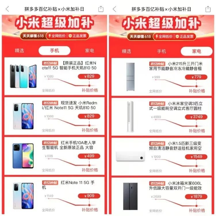 4月21日,拼多多百亿补贴“数码家电消费季”再次对手机、电视、空调、冰箱等数码家电产品发放超额补贴,小米等品牌产品的补贴力度均超过20%,继续击穿全网低价。