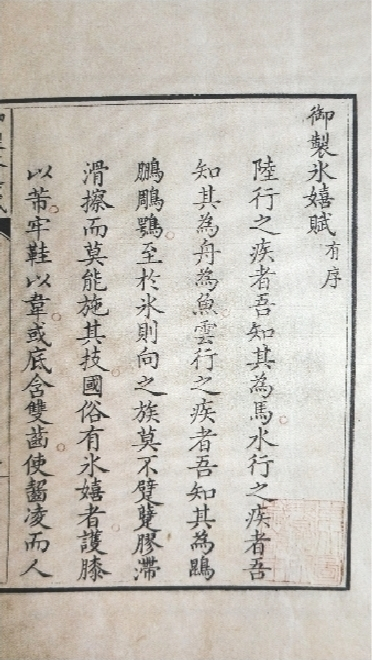 清朝乾隆皇帝撰写的《御制冰嬉赋》内页,现藏于辽宁省图书馆。
