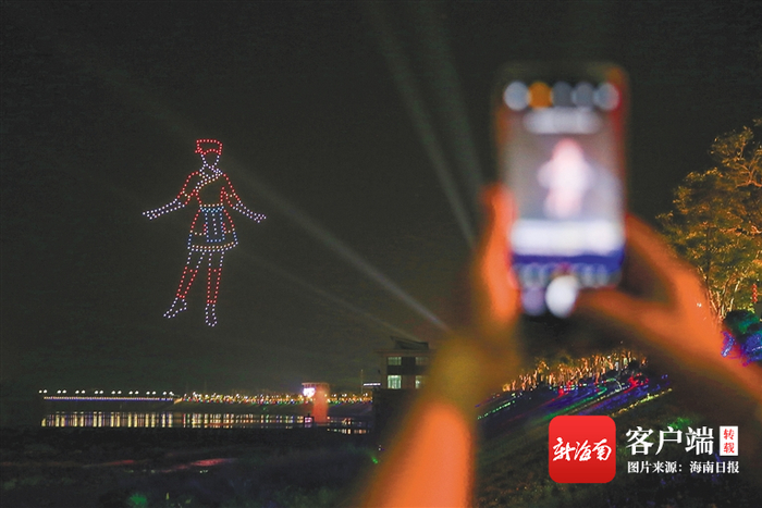 4月21日晚,乐东举办无人机展演迎接“三月三”到来。图为灯光秀展演活动,300架无人机组成苗族姑娘的图案。海南日报记者 王程龙 摄