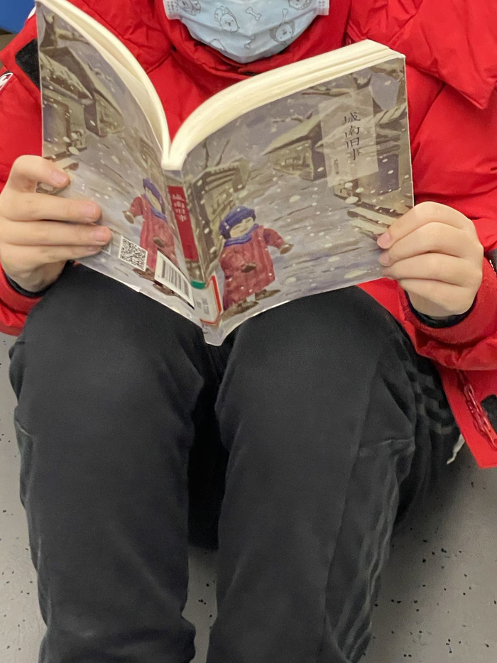 20230112。寒暑假就很容易遇到一些读书的孩子。他读的是从图书馆借来的《城南旧事》。这本经典小书有四五百个版本,虽然看到了封面,还是不好确定是哪个出版社出的。