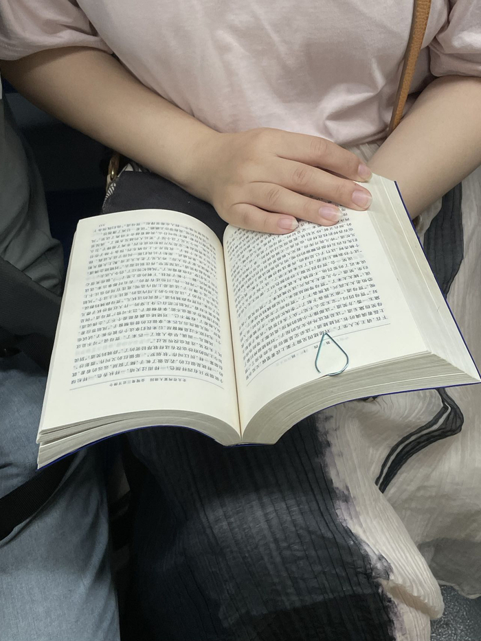 20220812。上车就看到她,一本厚厚的书,感觉很好看的样子。后来看到是人民文学出版社的《红楼梦》。翻看相册的时候发现,是7月28号那天遇到过的女士,当时她也在读《红楼梦》,同样的小金属书签,同样的手镯,同样的包,当时她读到第九回。