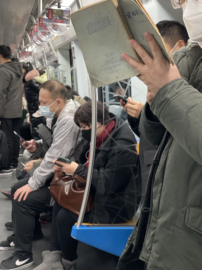 20230111。他出站刷卡时就在看书,在长长的电梯上也在看,上到地面后停顿了一小会儿,看了最后几眼以后才把书装进包里走出去。