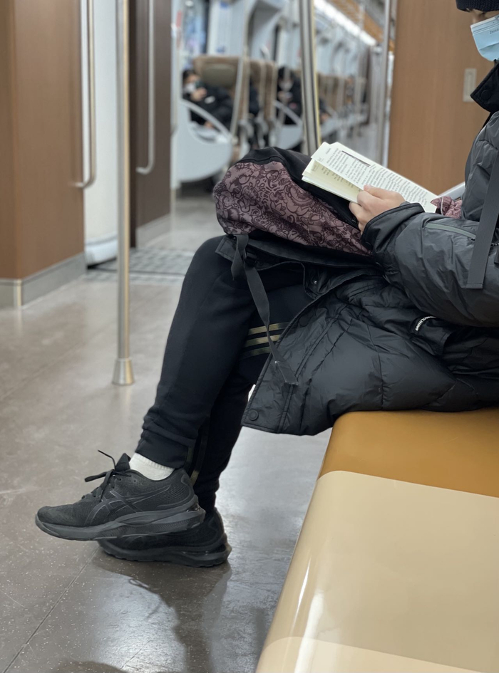 20230104。第二次乘坐北京地铁19号线,竟然跟高铁一样,后面还有软席。他读的是《丹尼尔斯经典跑步训练法:世界最佳跑步教练的跑步公式》,很小众的书了。