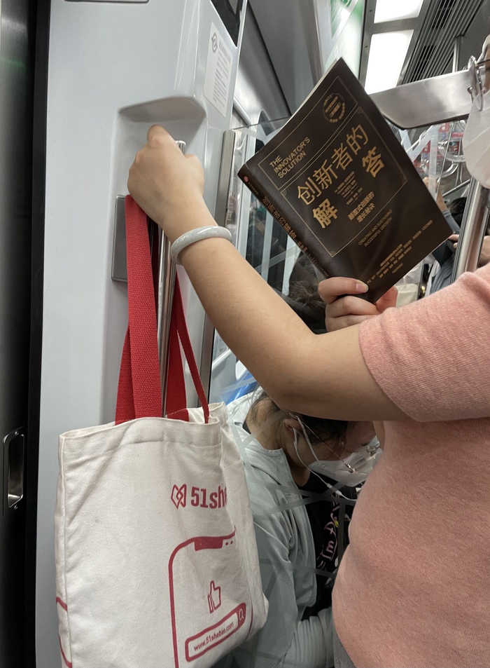 20220713。《创新者的解答:颠覆式创新的增长秘诀》。看到书想起人,是遇到过的地铁读书人,上次她也是这样站在门口读书。
