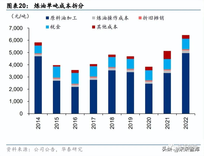 从公司历史经营情况回溯,炼油毛利在国际原油价格上升阶段表现较好,如 16Q1-18Q2 及 20Q2-22Q1,而在国际油价回落阶段由于库存损失的存在表现较差,如 18Q3-20Q1。22Q3 单季度炼油毛利下探至 2.6 美元/桶,是 14Q3 以来第三差的水平,22Q4 在需求低迷及高成 本影响下炼油毛利小幅回升至 3.1 美元/桶,但仍处于历史低位。我们认为国际油价的阶段 性回撤与中国需求的极端低迷使 22H2 成为炼油业务吨毛利水平的又一轮低谷。