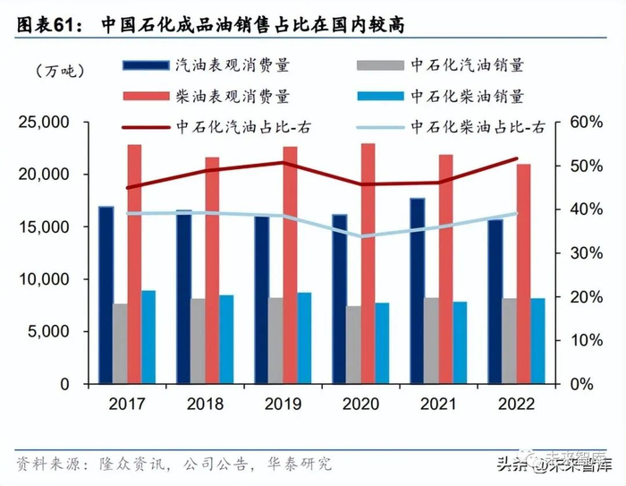 根据公司公告及隆众资讯数据,公司汽油及柴油零售价整体与法定最高零售价走势相同, 且 2020 年以来柴油零售价逐步向最高零售价靠近。公司柴油实际实现批发价亦在 22H2 更 加趋近于市场批发价。从市场结构而言,出口方面中石化自 2019 年以来一直是配额最多的企业,2022 年合计出 口配额 1351 万吨,占比 38%。国内销售情况来看,2022 年公司汽油/柴油总销量 8096/8193 万吨,分别占全国 52%/39%,市场份额自 2020 年以来持续提升。
