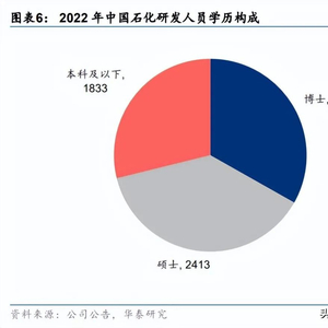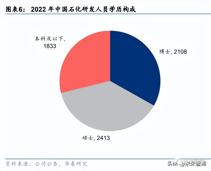 在传统能源需求增长减速背景下,中国石化深化科技体制机制改革,加大研发投入,2017 年以来公司费用化研发支出持续提升,2022 年达 128 亿元,较 2017 年增长 99%,资本化 研发支出 97 亿元,较 2017 年增长 91%。公司研发人员合计 6354 人,其中博士占比 33%,同比提升 1.6pct。在人员及激励方面,2022 年末公司员工较 2017 年减少 16%至 37.5 万人,人均薪酬较 2017 年上涨 64%至 27.2 万元/年。而面对传统能源需求增长的减速及新材料需求的扩大,公司 自 2017 年以来持续加大化工新材料板块投入,根据公司公告,中国石化 2022 年完成资本 开支 1891 亿元,同比增长 13%,其中化工及勘探开发板块分别为 586/833 亿元,同比增 长 14%/22%,2023 年公司预计完成资本开支 1658 亿元,同比下降 12.3%。