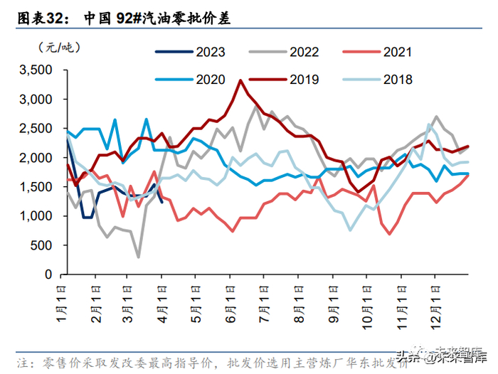 我们选取国内成品油最高零售价与某消费大省市场批发价作价差。2023 年初以来,汽油零 批价差持续下降,至 4 月 1 日为 1236 元/吨,处于 2018 年以来历史同期中较低水平,伴随 出行活动活跃,汽油批发资源过剩情况显著缓解,柴油零批价差 569 元/吨,处于 2018 年 以来历史同期的最低水平。在 2022 年 9-11 月,国内柴油零批价差持续处于 300 元/吨的最 低区间,显示出批发端柴油资源的紧张。