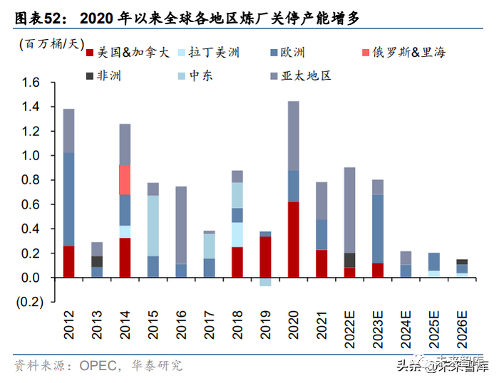 由于 2020 年以来疫情对成品油需求的全球性冲击,及减碳化转型的变革,全球炼厂 2020 年以来关停产能显著增加,据 OPEC 统计,主要集中于美国及加拿大、亚太地区及欧洲, 2020-2023 年预计将退出 393 万桶/天炼能,约占 2020 年全球炼能 4%。需求的复苏及炼能缺失带动下,全球汽、柴油盈利自 22Q2 进入快速上升期,美湾、鹿特 丹及新加坡汽油裂解价差自 22Q4 回落至历史常规水平约 10 美元/桶,3 月 24 日伴随需求 旺季来临分别反弹至 38.18/24.00/24.19 美元/桶,而柴油裂解价差仍居高不下,美湾/鹿特 丹/新加坡裂解价差 3 月 24 日分别为 40.78/28.62/21.36 美元/桶,整体仍较高。