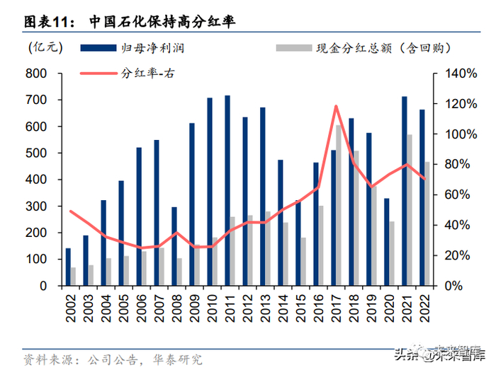 公司自 2016 年以来持续保持超过 65%的高分红率,2017 年甚至高达 118%,2022 年预计 公司总现金分红率 65%,另外自上市以来实施了首次回购,A/H 股分别回购 19 亿元/25 亿 港元。自 2005 年中国石化整体上市以来公司股价主要经历 4 次上升期,分别为 06-07 年(经 济过热叠加国际油价持续抬升)、09 年(4 万亿刺激下的经济回暖)、15 年(杠杆牛市及国 企改革预期)、17 年(乙烯产业链经济,大宗商品从暴跌中景气复苏),我们认为疫情后的 中国经济修复、全球性大宗商品的供给缺失及对于中国特色国有企业在改革下的积极变化, 将带动公司迎来估值重塑。