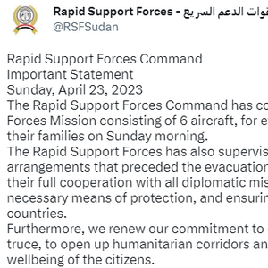 苏丹快速支援部队表示,会与所有国家外交使团充分合作,“提供一切必要的保护手段,并确保他们安全返回本国”。