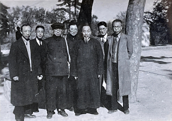 1951年2月8日,陈垣等欢送辅仁大学教授土改参观团团员,下午出发前在辅仁大学合影,左起:叶苍岑,柴德赓,陈垣,张重一。