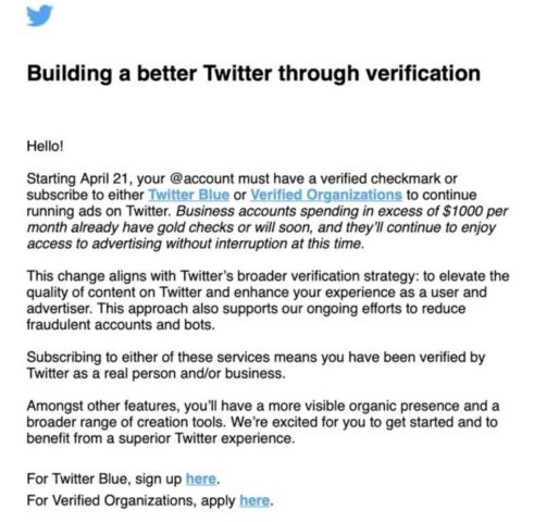 为了提高平台上广告的真实性和质量,从4月21日开始,想要在Twitter平台投放广告的业主或者企业必须订阅Twitter Blue服务,其费用为每月8美元(当前约55元人民币);或者直接购买Verified Organizations订阅,每月费用为1000美元(当前约6890元人民币)。