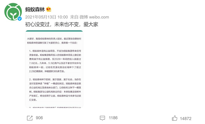 面对质疑蒋琤(花名:轻如)代表蚂蚁森林发了一份声明,向公众解释了蚂蚁森林的运行逻辑,澄清了几个关键问题:每一棵树一旦捐出,即属于国家、属于社会,树木及碳汇权属均不属于蚂蚁;蚂蚁森林的“绿色能量”只是一种量化个人碳减排、普及低碳生活理念的虚拟积分,不具备交易属性。也是在这份声明中,大家才知道,蚂蚁集团通过蚂蚁森林每年捐赠的金额是数亿元规模,仅2020一年,就高达7.6亿。