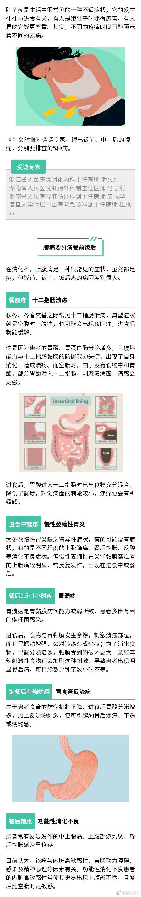肚子痛到底是哪里痛?几乎人人都有过肚子疼的经历,它的发生往往与进食有关,有人是饿肚子时疼得厉害,有人是吃完饭更严重。上腹痛很常见,虽然都是疼,但饭前、饭中、饭后疼的病因差别很大。戳图⬇️为你理出饭前、中、后的腹痛分别要排查哪些病 (@生命时报)