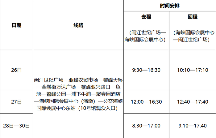 (1)可乘坐白湖亭—海峡国际会展中心区间专线,从白湖亭站出发直达海峡国际会展中心(1号馆)。