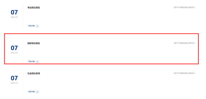 进入数字中国建设峰会官网,点击“观众报名”栏目,选择“团体观众报名”。