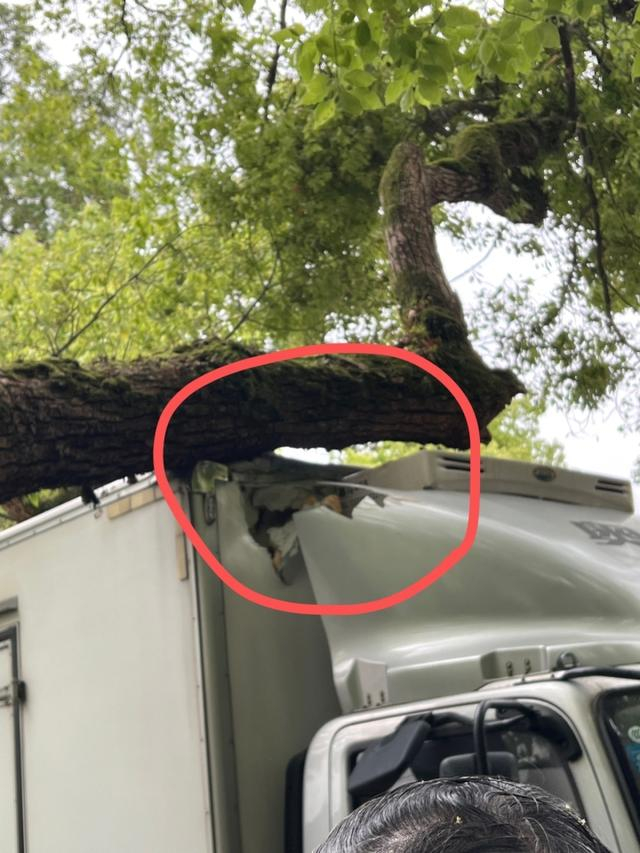 他赶紧刹车,下车一看,樟树树枝已经砸在车厢上。
