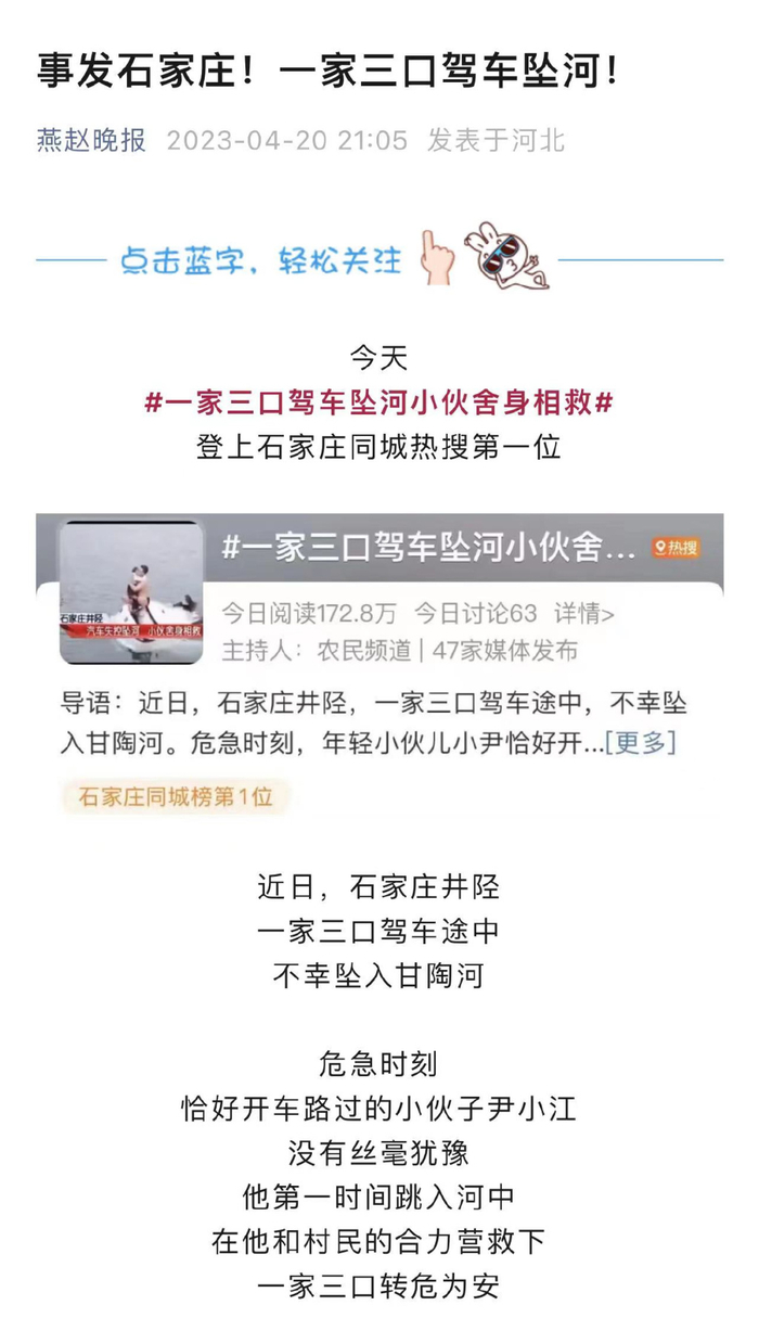 时间倒退至3月28日16时许,“那天,我正好从村里回市区上班。”家住井陉县秀林镇牛王庙村的尹小江说,他开车刚驶上村西边的桥,就听到桥的另一头有人呼救:“有人吗?快点救他们,快帮他们一下。”于是,尹小江立刻加快车速,不到一分钟就停在了呼救者的旁边。
