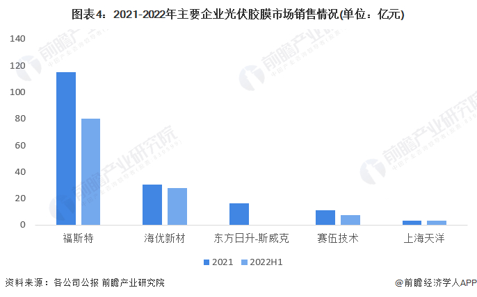 2021年福斯特销售光伏胶膜9.68亿平米,实现营业收入115.1亿元,2022年上半年创收80.3亿元;其次是海优新材,2021年光伏胶膜板块实现营业收入30.52亿元,2022年上半年营收约27亿元左右。